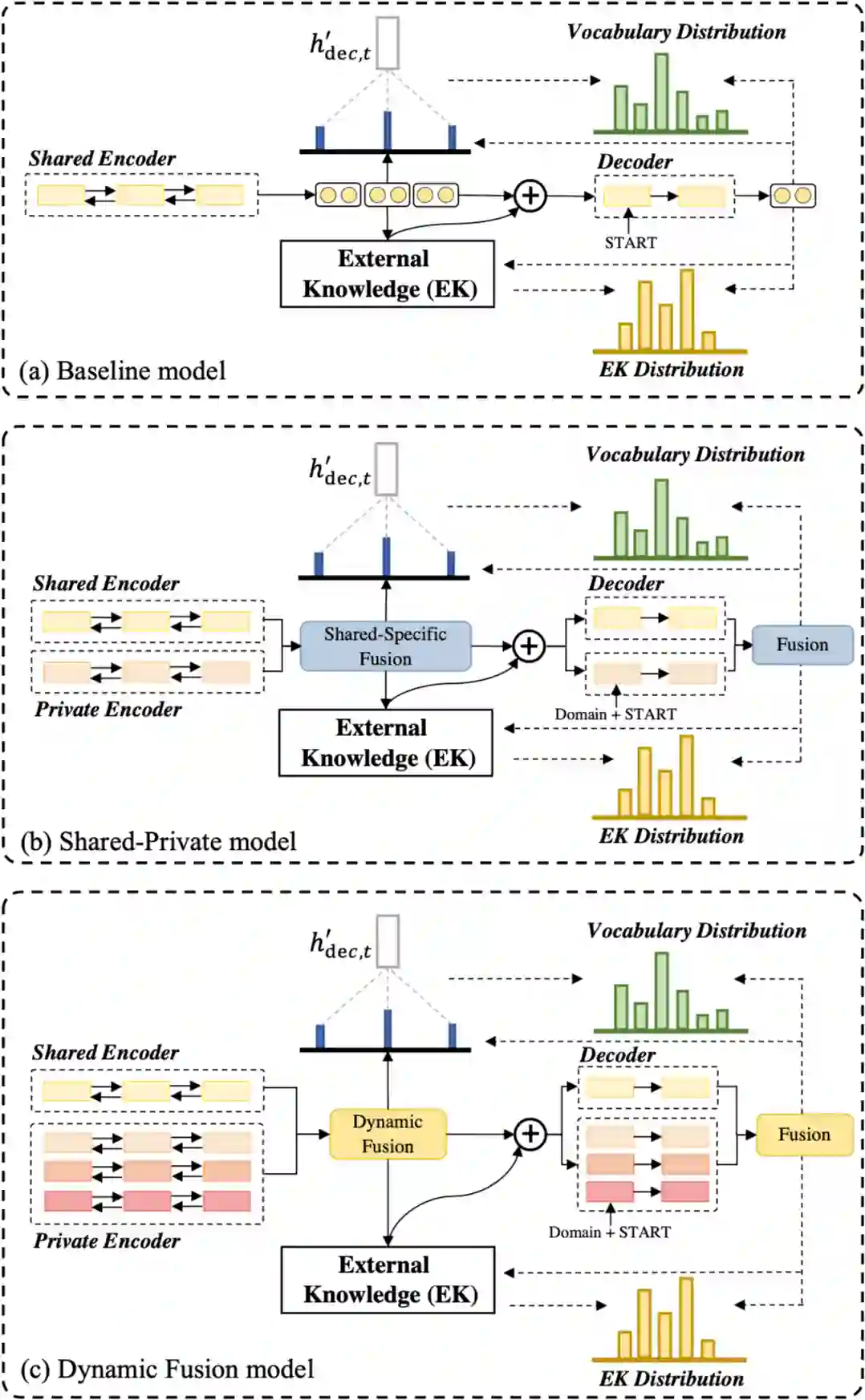 本文通过建模不同领域间知识的连接来解决已有方法的局限。已有的一个简单的baseline如图 (c),将领域共享的和领域私有的特征合并在一个共享-私有 (shared-private) 架构中。