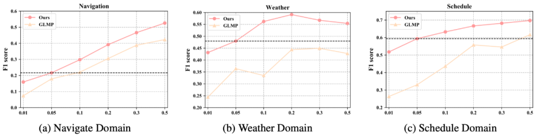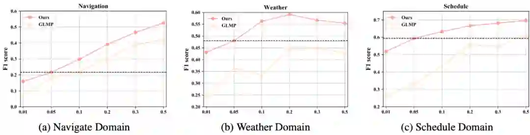 论文作者还做了低资源设定下的实验,如下图,结果证明本文提出的模型在不同资源情况都超过了 GLMP,在 5% 数据的情况下,在所有领域平均超过 GLMP13.9%。且本文的模型在仅用 5% 的数据训练情况下表现依旧由于 GLMP 用 50% 的数据训练的结果,这也进一了模型能够有效的迁移到低资源新领域。