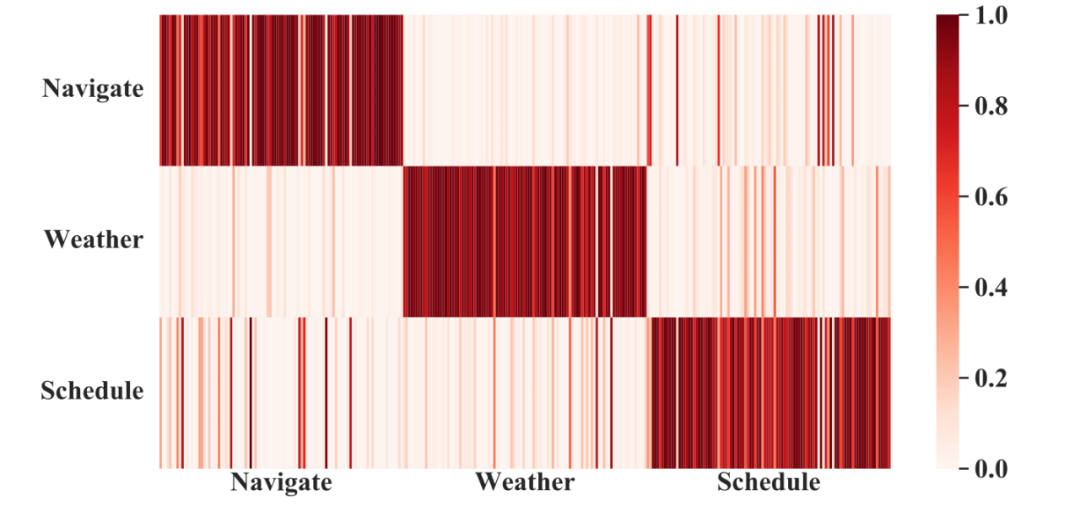 论文作者还为了方便读者理解动态融合层,在 5% 的低资源情况下,将每个领域 gate 的分布做了可视化,如图。一个领域的列包含 100 个例子,每一行是其对应的专家值(也可以理解为行列对应的线条颜色越深两个领域越相关,可迁移的知识越多)。