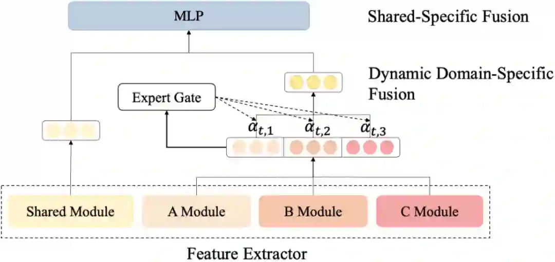 最终的领域特有特征向量是所有领域输出的混合,由 expert gate 的权重