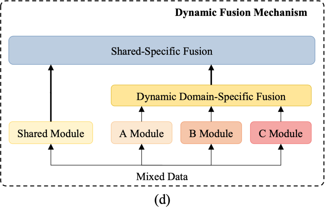 为了解决上述问题,论文进一步提出了一个新颖的 Dynamic Fusion Network (DF-Net),如图 (d)。相比于 shared-private 模型,即将介绍的动态融合模块明确地捕捉领域间的相关性。