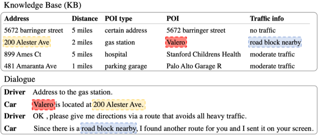 如图,是一个加入来自 SMD 数据集的基于知识 (Knowledge base, KB) 的面向任务的对话的例子。