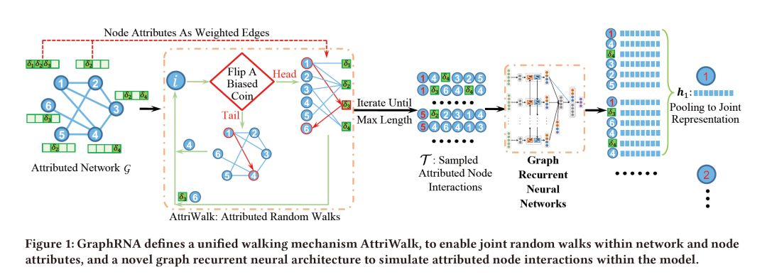 为了弥补这一不足,我们研究了在attributed网络上进行联合随机游动,并利用它们来提高深度节点表示学习。提出的框架GraphRNA由两个主要组件组成,即,一种协作游走机制—AttriWalk,以及一种为随机游走量身定制的深度嵌入体系结构,称为图递归网络(graph recurrent networks ,GRN)。AttriWalk将节点属性看作是一个二分网络,并利用它来促进节点间的离散化,减少节点间向高中心汇聚的趋势。AttriWalk使我们能够将突出的深度网络嵌入模型-图卷积网络推向一个更有效的架构——GRN。GRN赋予节点表示以与原始attributed网络中的节点交互相同的方式进行交互。在真实数据集上的实验结果表明,与目前最先进的嵌入算法相比,GraphRNA算法很有效。