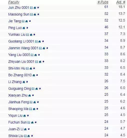 在论文作者中,论文数量排名靠前的清华学者如下: