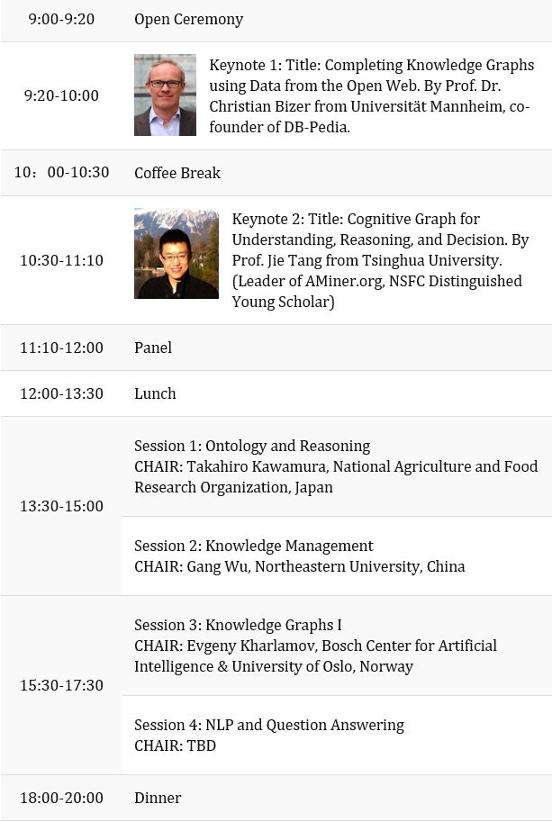 本届会议吸引了来自学术界和工业界的许多高质量投稿,现在组委会已经精心安排好了会议内容,包括来自 DB-Pedia 联合创办人 Christian Bizer 的“利用 Open Web 做知识图谱补全”,来自清华大学唐杰教授的“认知图谱与推理”、来自保奥斯陆大学的 Evgeny 教授“知识图谱与工业 4.0”等三个国际顶尖学者的 keynotes;以及来自国际知识表示与推理资深专家 Diego Calvanese 教授的“虚拟知识图谱”、平安医疗倪渊博士的“面向智慧临床辅助决策的医疗知识图谱”、哈尔滨工业大学刘铭博士的“开放领域的知识图谱构建”等三个实战性 tutorials,以及 research paper,poster,demo 等会议环节。