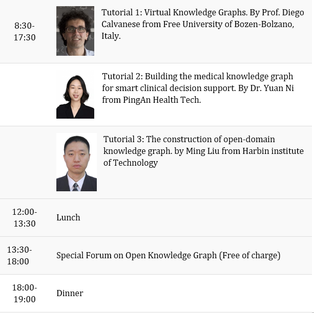此外还将在 25 日举办 OpenKG 特别论坛(免费开放),邀请来自中日韩欧等多个国家和地区的知名专家就知识图谱发展前沿展开讨论,欢迎大家参加!Program OverviewTutorials and OpenKG Special Forum2019/11/25