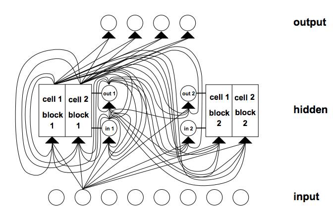 具有8个输入单元,4个输出单元和2个大小为2的存储单元块的LSTM网络示例.in1标记输入门,out1标记输出门,cell1 = block1标记块1的第一个存储单元。
