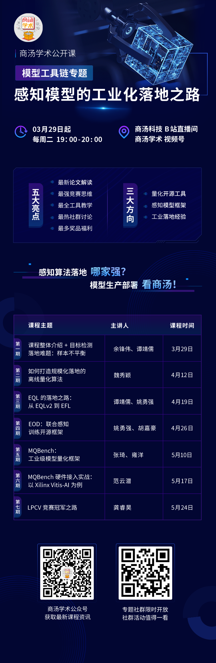 本次课程将从工业级目标检测、模型量化两个角度出发,介绍商汤-模型工具链团队在解决算法落地过程中的技术思考,同时介绍一系列实用的模型生产开源框架。通过本次课程,同学们可以获得大量实用的模型训练和压缩技巧,深入理解模型的工业化落地流程是如何变得更加高效和便捷。
