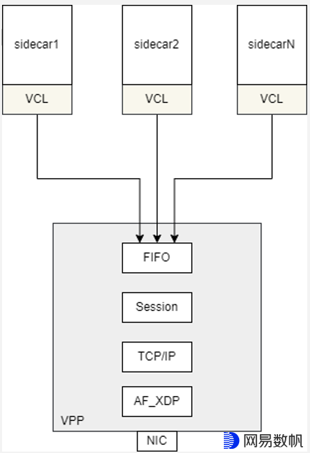 为了兼顾到性能和资源占用,我们选择 VPP 作为用户态协议栈。VPP 作为独立进程实现用户态协议栈,并提供轻量级的 VCL 动态库供 sidecar 集成以实现 socket 接口的劫持,VPP 和 VCL 之间通过共享内存进行通信。