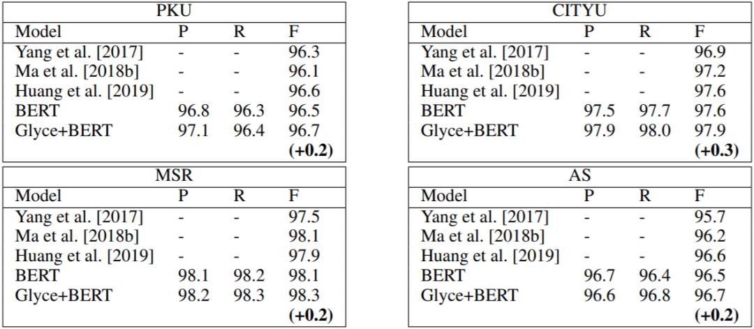 在中文 SRL 和中文依存句法分析上,相比之前的最优结果(未使用 Bert),使用 Glyce 之后能取得接近 1 个点的提升。