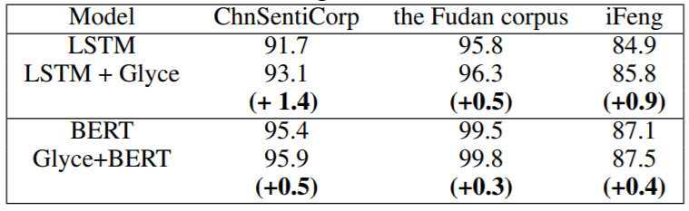 此外,在句对分类、单句分类任务的各个数据集上 Glyce-Bert 都能取得较 Bert 更好的结果,下表是实验结果。