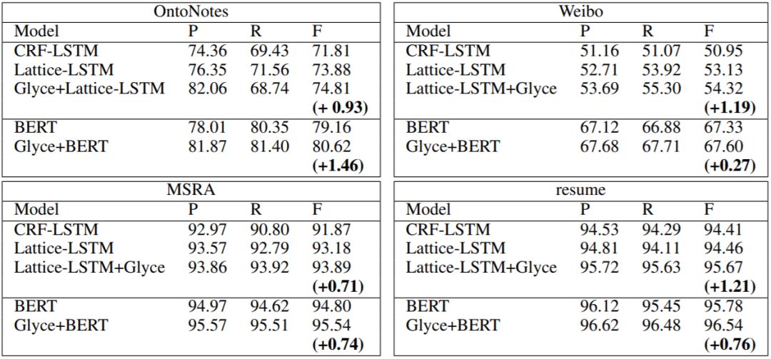 可以看到,Lattice-LSTM 超过所有的非 Bert 模型,而 Bert 模型超过所有非 Bert 模型。在使用了 Glyce 之后,Lattice-LSTM 涨约 1 个点,Bert 模型涨幅不定,这与数据集有关。