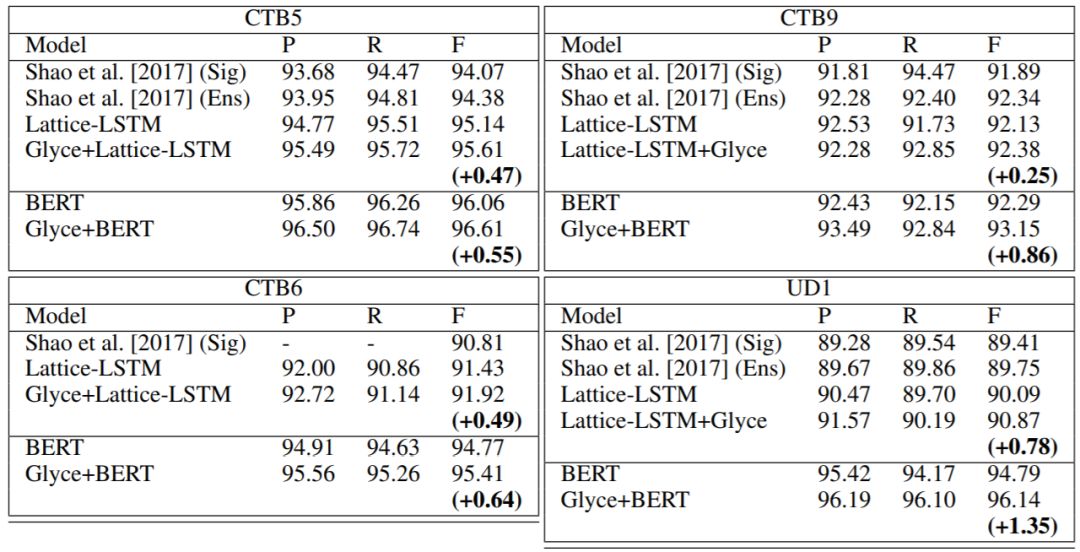 下表是 POS 实验结果,加入 Glyce 后,对 Lattice-LSTM 和 Bert 都有相应的提升。