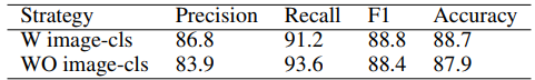 下表是有无图像分类损失 $\mathcal{L}(\text{cls})$ 的结果,可以看到,加上图像分类损失后,F1 值提高了 0.4,Accuracy 提高了 0.8。使用图像损失,是为了避免小数据(约 10000 个字符)下的过拟合。