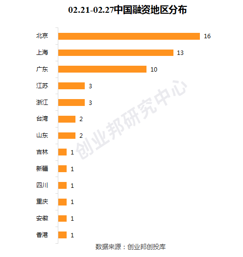 本周北上广融资事件共39起,占比69.64%;江苏、浙江各3起;台湾有2起。