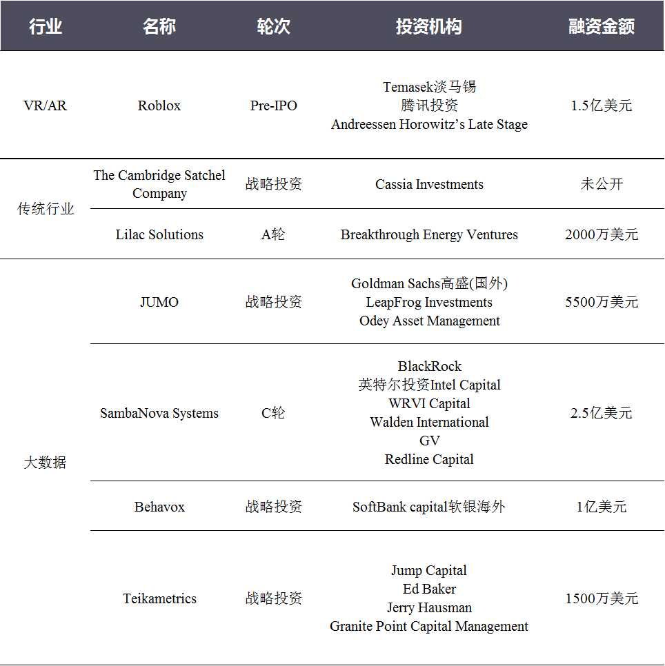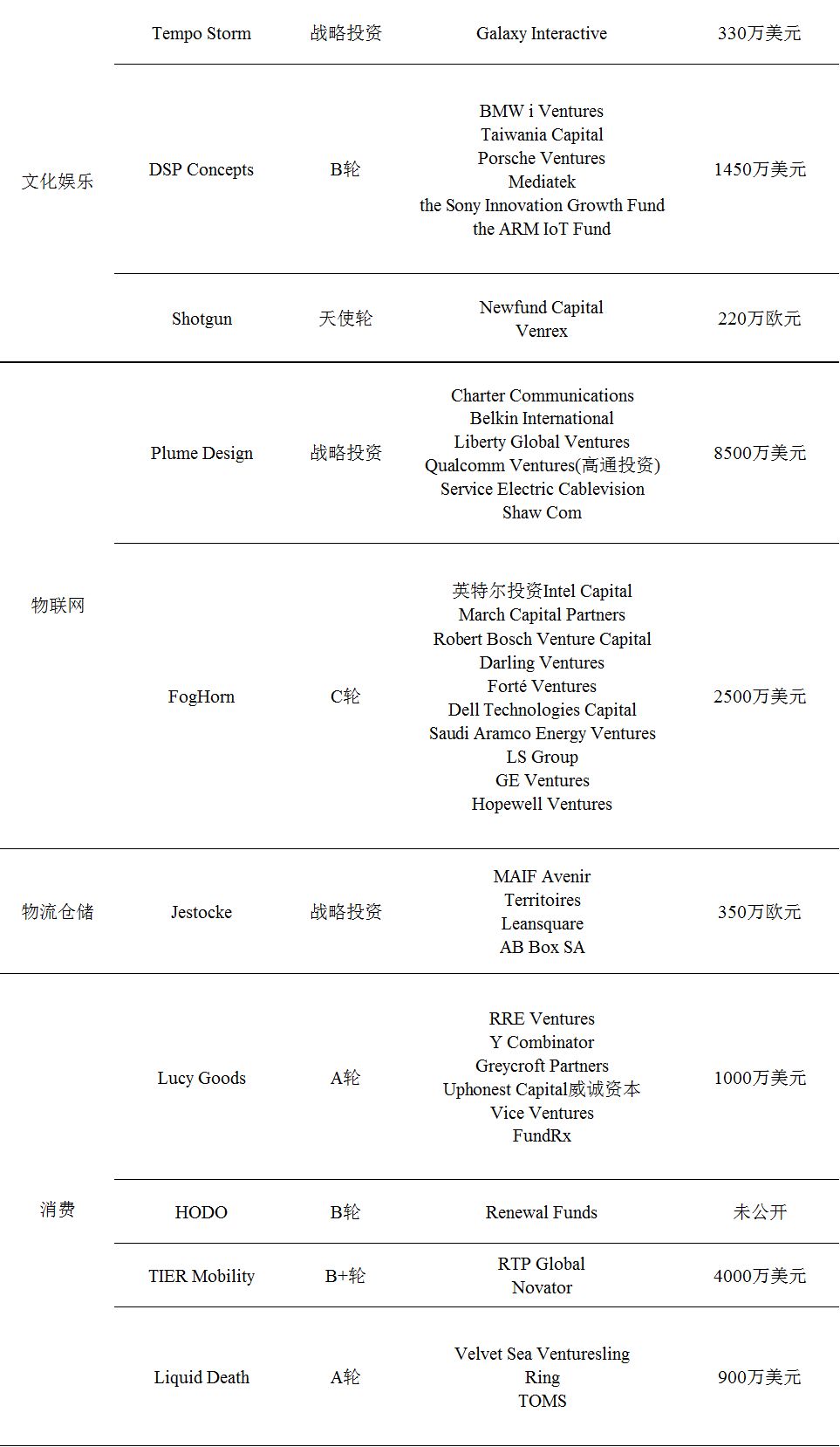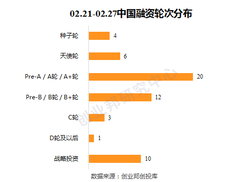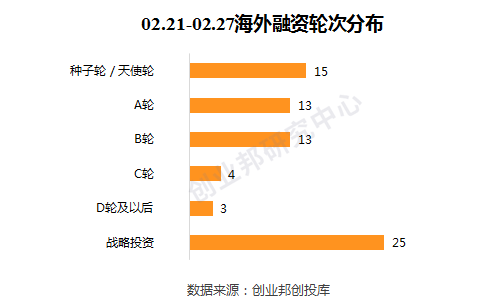 本周海外融资事件的融资轮次主要集中在前期(种子轮、天使轮、A轮),共28起;中后期(B轮、C轮、D轮及以后)有20起;战略投资有25起。