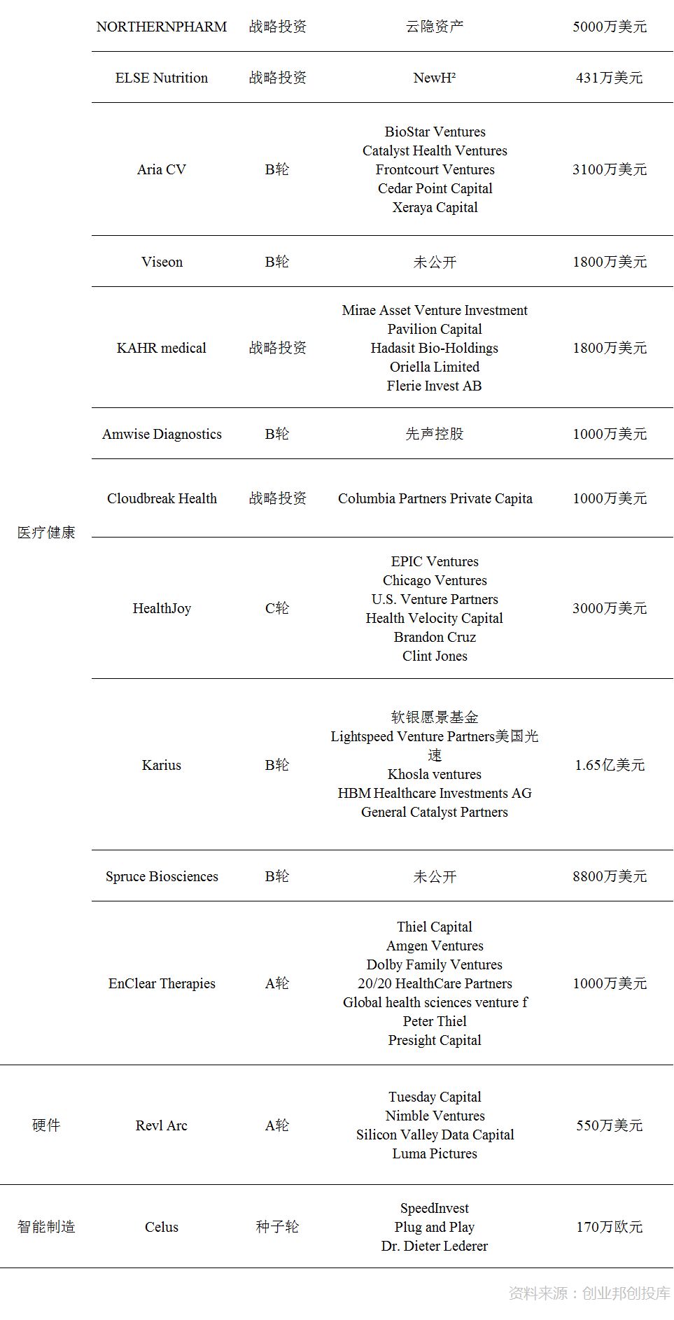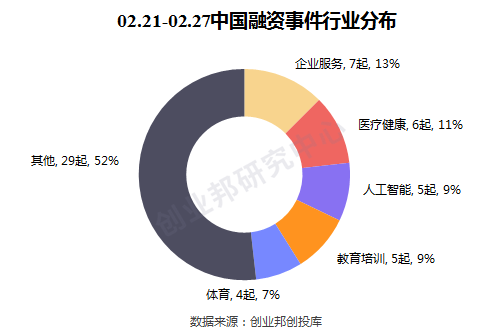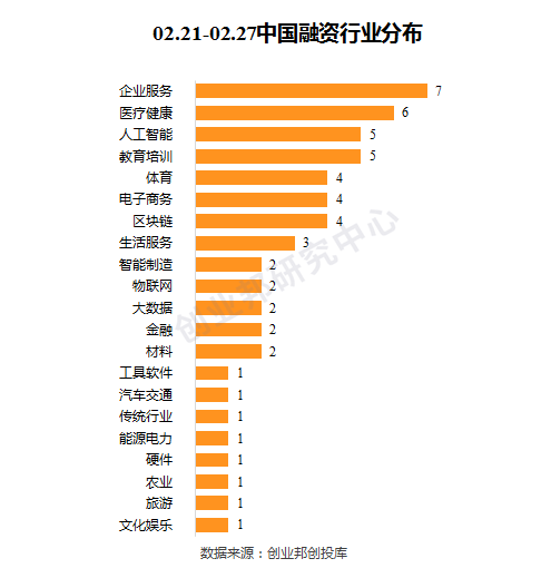 本周披露融资事件涉及21个行业领域,其中企业服务7起,医疗健康6起,人工智能、教育培训并列5起,体育、电子商务、区块链并列4起。