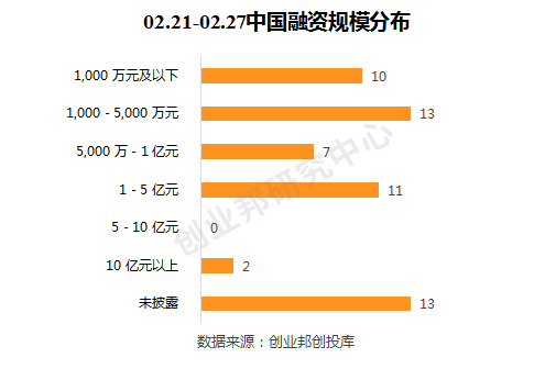 本周融资事件的融资规模在1,000-5000万元的数量最多,有13起。