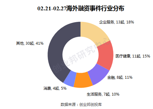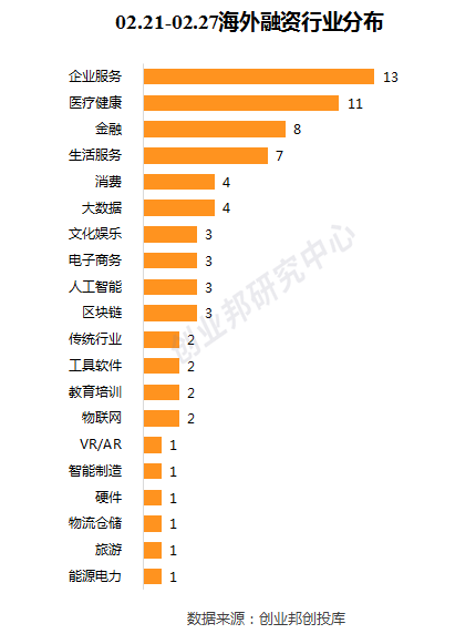 本周披露海外融资事件涉及20个行业领域,其中融资案例数量最多的五大行业分别是:企业服务13起,医疗健康11起,金融8起,生活服务7起,消费、大数据并列4起。
