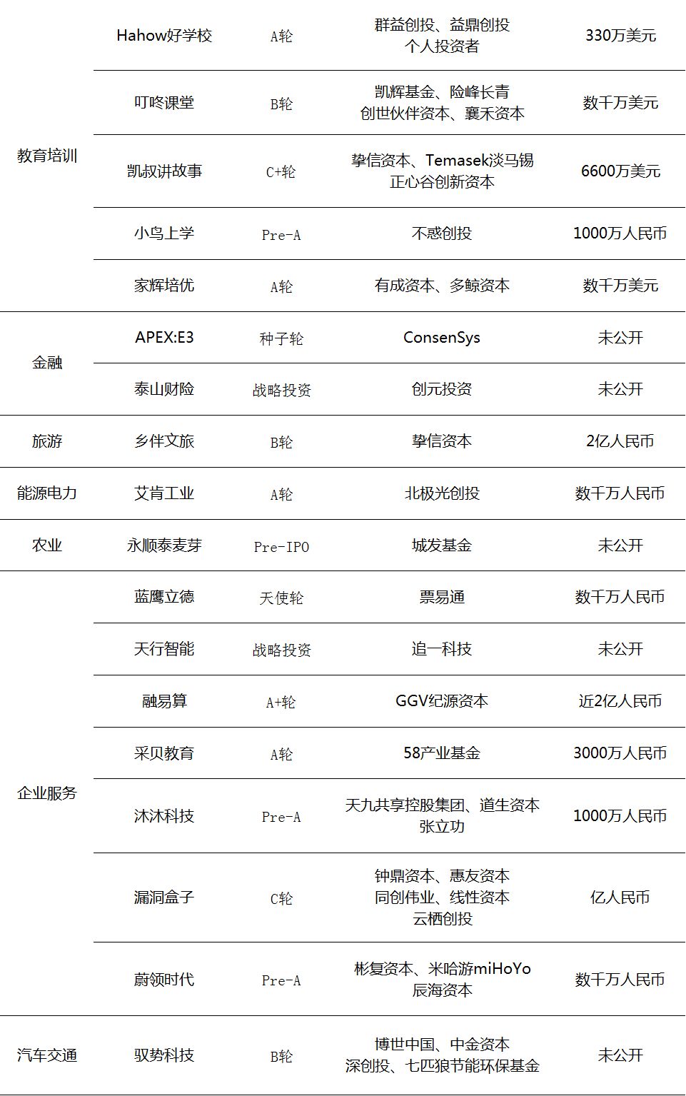 单笔过亿人民币事件中,教育培训3起,人工智能2起,区块链、电子商务、工具软件、生活服务、医疗健康、旅游、企业服务各1起。