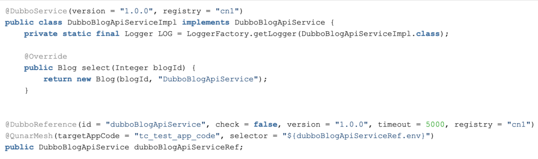 大家可以看到这里面,比如上面的代码,有 Dubbo Service 这样的一个服务的提供,下面就会有 Dubbo Reference 这样的一个服务的引用,并且在注解里大家可以看到 Qunar Mesh 这样的一个注解,这个注解就是用于开启我们的 Mesh 功能的,是对于 Dubbo 这个协议的。对于 HTTP 协议的话,其实跟官方的也是非常类似,我们也是使用了 OpenFeign 这样的一个组件来进行通信,下面也同样会有 Qunar Mesh 组件进行 Mesh 化。