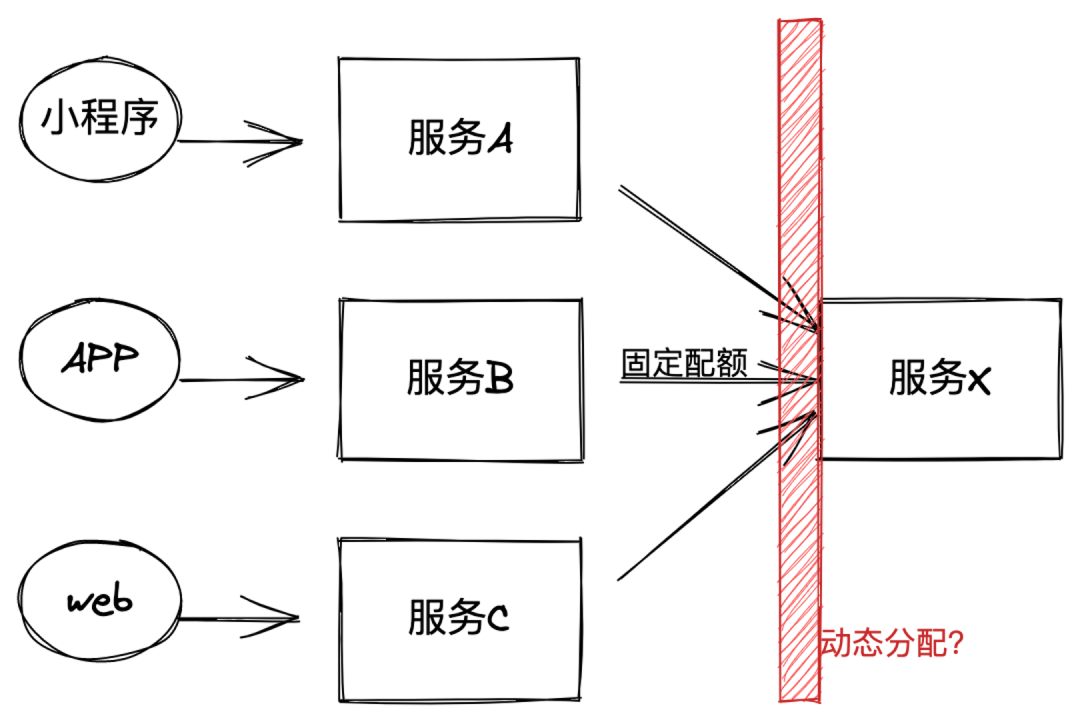 接着我来介绍一下限流里面我们做的一些工作,这里面我们做的模式我把它叫做动态限流。普通的一个限流里面,通常来说是这样的一个方式,我们有 A、B、C 的服务都对 X 这个服务进行了调用,它的来源可能是不一样的,X 为了保护自身的状态是可用的,它不可避免就要对上游 A、B、C 的这些访问分配固定的一些配额,谁超过了配额就不可用了。