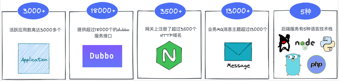 接着介绍一下我们去哪儿网的在线数据。我们现在的应用数据是这样的:活跃的、在线跑着的应用大概有 3000 多个;提供了 18,000 多个 Dubbo 的 RPC 服务接口;有超过 3500 个 HTTP 域名;13,000 多个 MQ 的主题;公司内部大概有 5 种语言的技术栈,当然主要是以 Java 和 Node 为主。