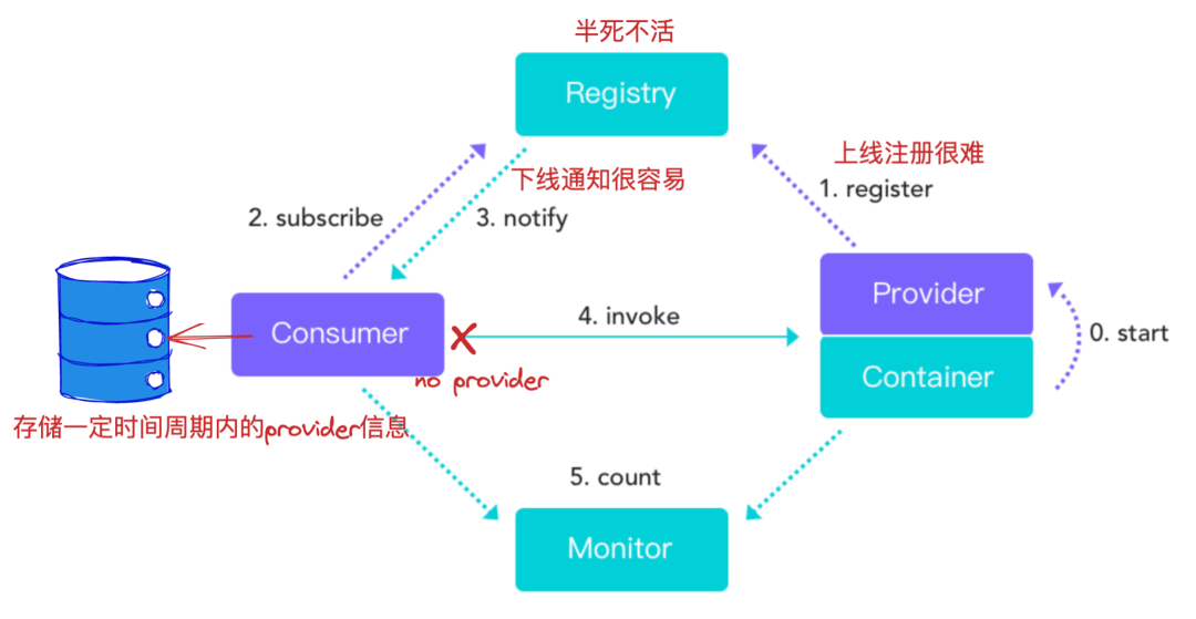 对于注册中心来说,它只负责一个注册和变更通知的作用,但是在有一些特定的场景里面并不是这样子的。举个例子来说,当一个注册中心因为自身的原因处于一个半死不活的状态,它一会儿能服务、一会儿不能服务的时候,就会发生一个比较恐怖的事情,Provider 端因为它要跟注册中心去保持心跳判活的状态,所以需要和注册中心保持长期有效的连接。如果是失效的情况,作业中心就会判断这个 Provider 是不存活了。不存活的时候,注册中心就会把这个消息通知给 Consumer 端,Consumer 端只要接收过一次下线通知,Consumer 就会从它的列表里面把这个 Provider 从本地的缓存里面去移除掉。