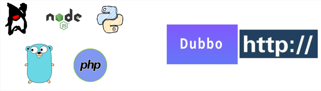 第二个它在多语言、多协议的场景里面不可避免地就会出现治理平台比较分散,比如像 Dubbo 的话,我们其实会有一个 RPC 的服务治理平台;HTTP 的话我们其实有类似于网关 Nginx 或者是 OpenResty 去对它进行治理;其他的也会相应的治理,甚至可能是在配置中心去对它进行治理等等。