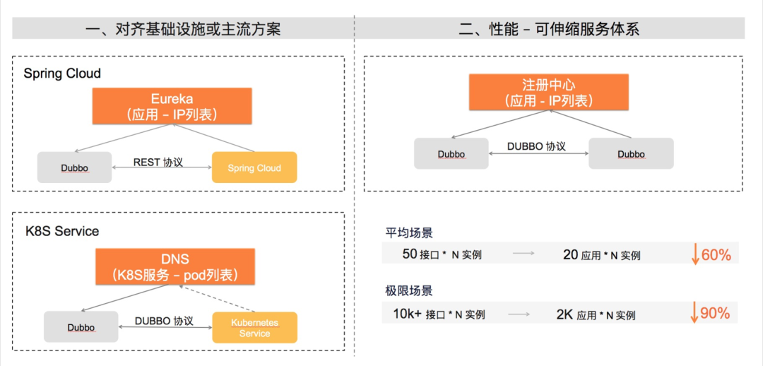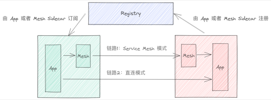 ServiceMesh 里面我主要介绍一下几个关键点:第一个就是注册模型,因为它是一个多协议、多语言的方式,其实比如 Dubbo 或者 HTTP,它在服务层面其实是不统一的,在注册中心我们想要以一个统一的注册中心去服务发现的时候,不可避免地就需要把它的维度统一掉,我们是怎么做到的呢?我们其实是参考了业界现在比较火的,或者基本上应该是事实上的标准,通过服务 - 实例这样的维度去抹除掉了类似 RPC 这种 Dubbo,这种接口的维度,与原来的注册中心去进行双写,来保证 Mesh 化的和非 Mesh 化的都能支持。