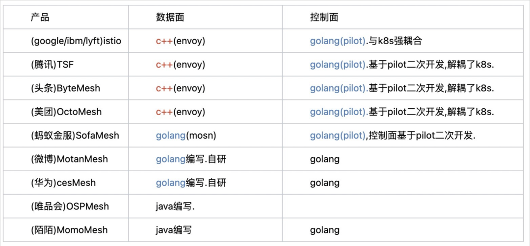 其实从数据面上来看,envoy 还是占大头的,但是我们最终其实没有选择 envoy,主要是因为我们在 C++ 技术栈里面储备的人才是不够多的。第二个在控制面上,大家基本上都是基于 Istio 模式去做的,当然也大部分都做了二次的开源,我们最终也是选择这样的一个模式。