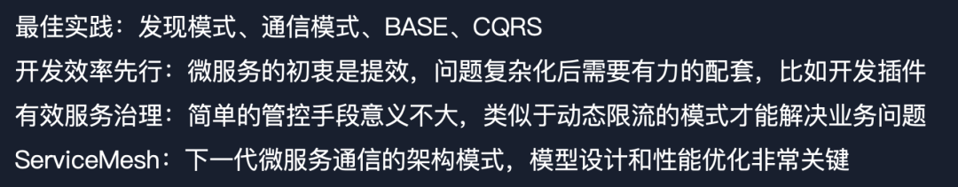 第一个是在发现模式、通信模式上的,我们需要去因地制宜做一定的最佳实践;在架构模式里面,比如说像 BASE 模式和 CQRS 模式,我们都可以在合适的场景里面放心大胆,或是尽可能去启用它们的。