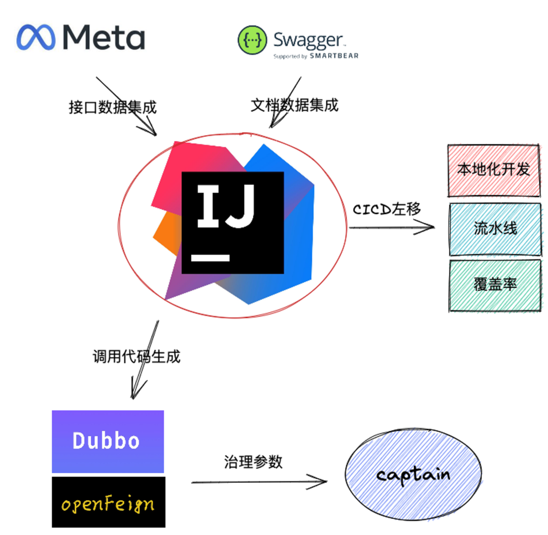 我们其实做了一个基于 idea 的 IDE 的开发插件。开发插件它可以满足以下的几个功能,比如像服务调用的代码自动生成,这个是一个什么样的场景?是说当你在 IDE 里面打开我这个插件,你就可以选择对方的应用、对方提供的服务,直接就一键生成调用的代码,甚至包括一些其他 jar 包的引入,比如如果它是 Dubbo 协议的,它会自动引入这些 Dubbo 的 SDK 和对方提供的这些 API 的 jar 包等等。
