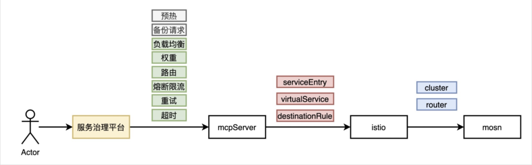 然后第二个就是配置的模型,这里面就是服务治理平台,我们其实自定义了一些存储的格式,然后通过 MCP 的方式,Server 的组件去转换 Istio 需要的数据格式。Istio 拿到了之后,通过标准的 XDS 的数据格式下发到 MOSN 里面,这一段我们基本上就是依赖原有的一个功能,主要是在左侧这部分,我们自定义的这部分组件的数据格式是比较关键的。