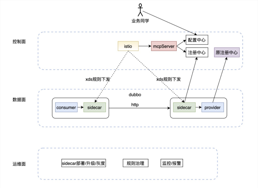 我们最终的选择是,数据面上我们选择了 MOSN,而不是 envoy,MOSN 是基于 Go 开发的一个阿里巴巴官方出品的组件,这个组件其实是一个偏网关代理型的一个组件,但是在上面去实现 Mesh 的逻辑,其实是比较方便的,特别是针对基于 Dubbo 这个协议的 Mesh,MOSN 支持得是比较好的;在控制面上,我们也是基于 Istio 去做了二次开发,也有一定的自研组件,比如说 mcpServer、配置中心、注册中心这些都是我们自研的。在运维面的话,我们也是自研了一套运维相关的组件,比如 Sidecar 的部署、灰度的升级等等,还有一些规则治理、监控报警等。