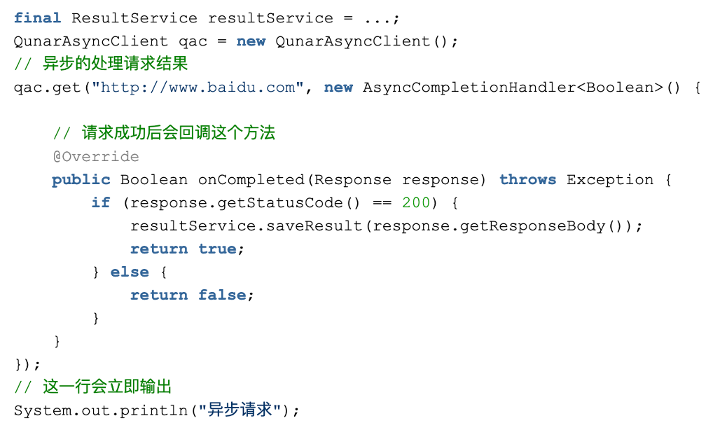 然后在异步的这个场景里面,去哪儿网其实做了一些自己内部的一些支持,比如说我们封装了异步的 HttpClient,把公司内部其他的组件类似于 QTrace,还有一些其他基础的监控、日志等等之类的组件都做了统一的封装埋点。