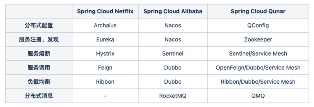 对应地可以看到 Spring Cloud Alibaba 也有自己的实现,像 Nacos、Sentinel、Dubbo、RocketMQ 等等。我们其实就在思考着去哪儿网自己有这么多自研的组件,是否能够适配 Spring Cloud 这样的一套标准,进而去达到开发提效、互相串通组件的目的?