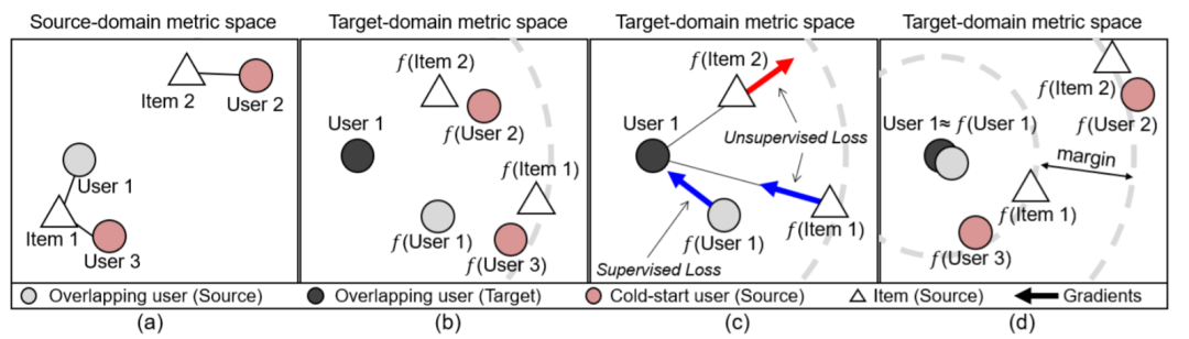 这篇文章也指出EMCDR中,使用共享的用户和物品来训练映射函数,容易导致映射函数过拟合,泛化性能不好,因此为了增强映射函数的泛化性能,这篇文章提出了一种基于梯度的元学习的方法来训练映射函数,使得训练好的映射函数在没见过的用户和物品上有更好的泛化性能。