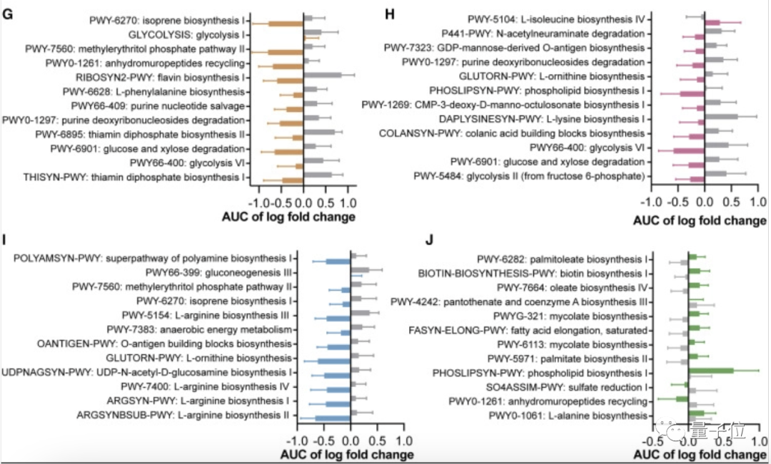 其中,三氯蔗糖组微生物变化明显影响了嘌呤代谢;而糖精组的糖酵解和葡萄糖降解途径,阿斯巴甜组的多胺类代谢,甜叶菊组的脂肪酸合成也分别受到严重影响。