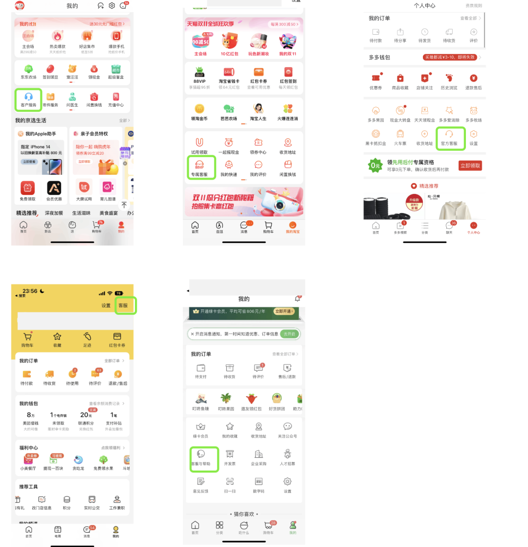 客服代表平台,代表商家的形象,我截取了我使用较多的几个APP,可以看出,客服的入口大多数是在【我的】tab下,有独立入口,相对明显。因为线上的客服入口,是用户和平台之间的通道。