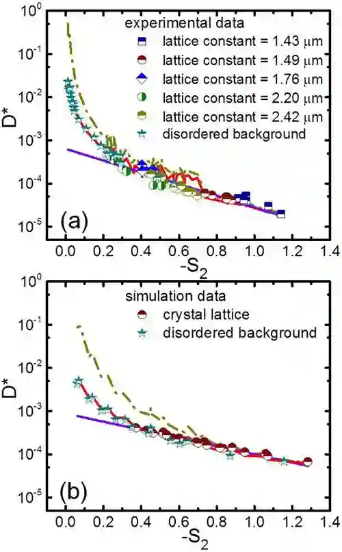 最近,中国科学院物理研究所/北京凝聚态物理国家研究中心软物质重点实验室SM8组博士生宁鲁慧和博士后刘鹏在陈科研究员和杨明成副研究员的指导下,利用光学显微实验和计算机模拟,系统地研究了在准二维胶体系统中示踪荧光粒子在复杂结构背景中的扩散动力学。他们利用带电胶体粒子组成不同的背景结构,包括有序的晶体背景和无序的液体背景(图1),并观察荧光小球在背景中的扩散。通过测量荧光粒子的长时间扩散系数和系统的两体结构熵S2,他们发现在无量纲化之后,不同系统中的粒子扩散系数唯一地依赖于体系的结构熵,从而第一次在实验上证实了扩散动力学与介质结构之间存在普适的标度关系(图2a)。然而,已有的理论模型均不能定量拟合实验测得的普适曲线(图2中紫色实线和黄色点线),其中指数标度模型在高结构熵区域严重偏离了实验结果。为了解决这一问题,他们从扩散的微观机制出发,同时考虑了胶体溶液中溶剂分子的影响,提出了一个新的扩散系数与系统结构熵之间的标度关系。新的标度律能够在三个数量级的变化范围内定量的预测胶体粒子在不同环境中的扩散系数。这一标度关系的普适性通过计算机模拟在更大范围内的介质背景中得到了验证(图2b)。这一发现为预测和调控复杂环境中的扩散现象提供了一个有力的工具,并为探索在非平衡态条件下如玻璃化转变和活性体系中的扩散过程提出了一条新的思路。相关结果最近发表在物理评论快报上(Physical Review Letters, 122, 178002 (2019))。