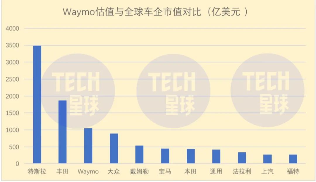2020年3月3日,Waymo宣布获得第一轮外部投资,共22.5亿美元,投前估值达到了1050亿美元,远远超过大众、戴姆勒、通用等一众车企。