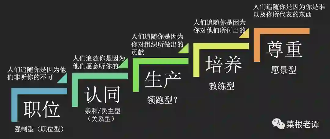 在上面的案例中,如果你经常选择A,你的领导力的层次就只是在第一层,你是靠你的职位权利压迫下属完成工作;而选择B,则进入下一个层次,你的民主和亲和力会让下属对你产生认同感。