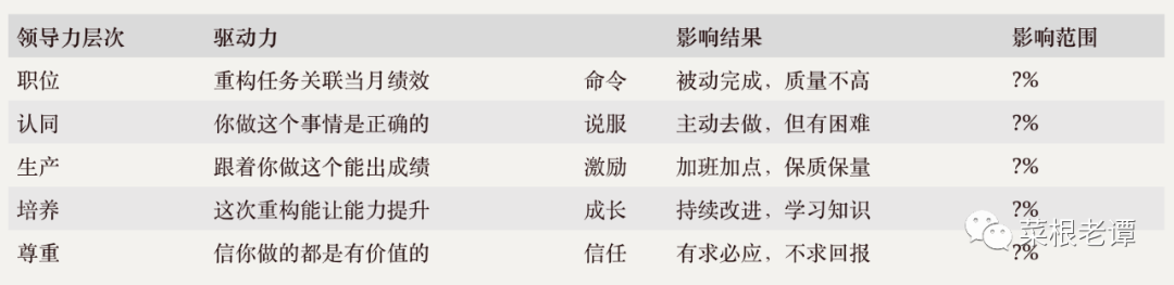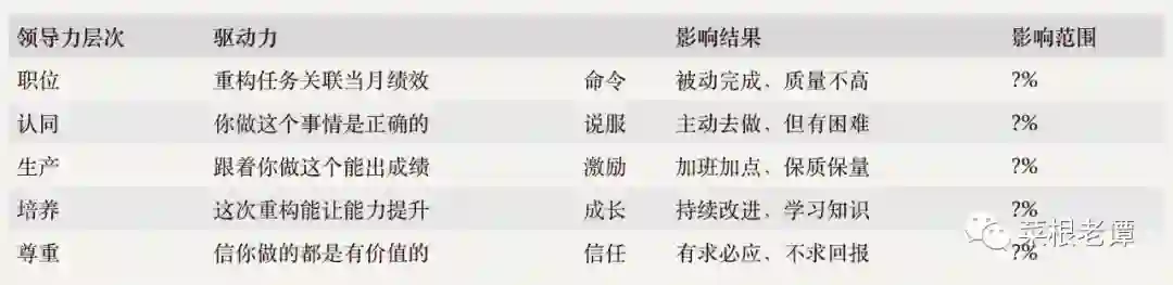 我们还是以一次产品重构这样的任务为例,对比一下不同领导力层次对该事情的影响: