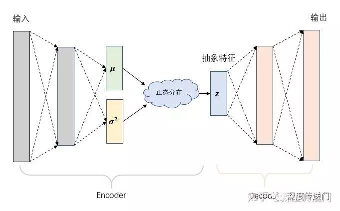 Vairational AutoEncoder(VAE)是Kingma等人与2014年提出。VAE比较大的不同点在于:VAE不再将输入x映射到一个固定的抽象特征z上,而是假设样本x的抽象特征z服从(μ,σ^2)的正态分布,然后再通过分布生成抽象特征z。最后基于z通过decoder得到输出。模型框架如下图所示: