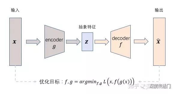 在介绍经典的基于神经网络的AutoEncoder模型之前,先来整体看一下AutoEncoder框架的基本思想,如下图所示。AutoEncoder框架包含两大模块:编码过程和解码过程。通过encoder(g)将输入样本x映射到特征空间z,即编码过程;然后再通过decoder(f)将抽象特征z映射回原始空间得到重构样本x',即解码过程。优化目标则是通过最小化重构误差来同时优化encoder和decoder,从而学习得到针对样本输入x的抽象特征表示z。
