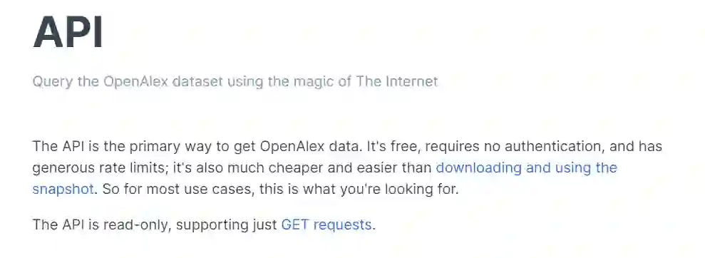 目前OpenAlex已经发布新的 REST API 。与之前下载安装的方式相比,可以更快、更简单地访问 OpenAlex 数据库,无需账户和令牌,完全免费。