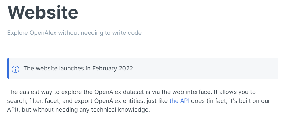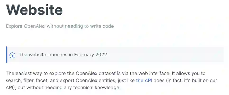 OpenAlex表示,探索 OpenAlex 数据集的最简单方法是通过 Web 界面,无需编写代码即可探索 OpenAlex。不过目前网站开发尚未完成,预计在今年2月上线。