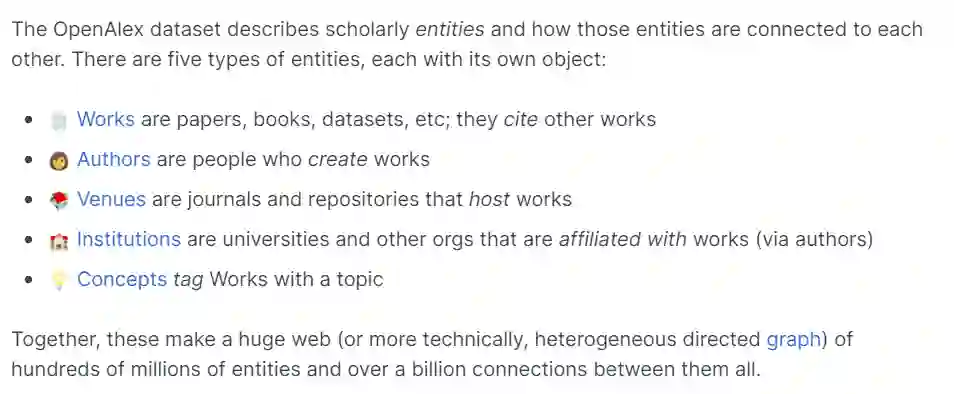 OpenAlex数据集描述了5类学术实体以及这些实际之间的联系。每类实体分别对应其目标: