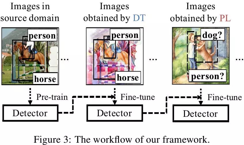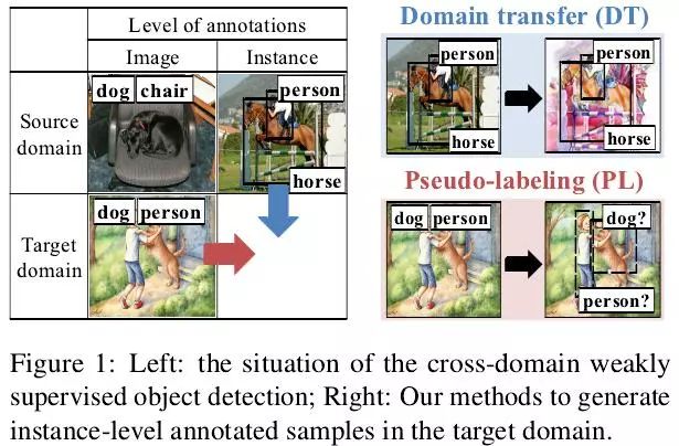 在没有Bounding Box标签的情况下,如何使得检测器也能够在卡通画图像上得到比较好的目标检测性能?图1左侧子图解释了不同层面的标注形式,在源域(Pascal VOC)中既有Image-level的标签也有Instance-level的标签,在目标域中只有Image-level的标签。